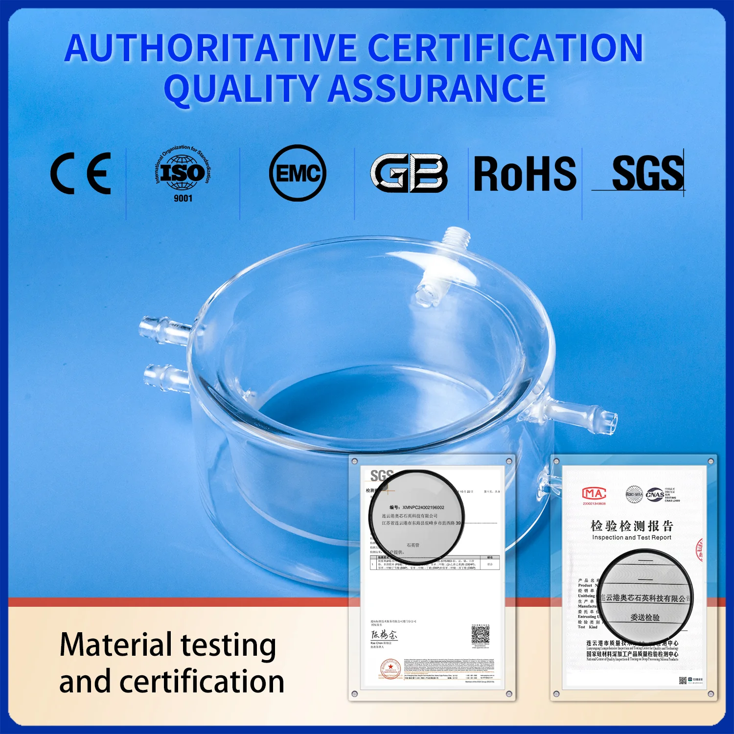 La calidad es primordial en nuestro proceso de fabricación. Somos un fabricante certificado ISO 9001:2015, lo que garantiza que nuestros procesos cumplen con los estándares internacionales de gestión de calidad.Nuestros productos también se someten a rigurosas pruebas SGS de pureza y rendimiento. Utilizamos materias primas de alta pureza (hasta 99,998% de SiO2) para producir productos de cuarzo fundido y sílice fundida con una estabilidad térmica excepcional, alta resistencia a la temperatura e inercia química.