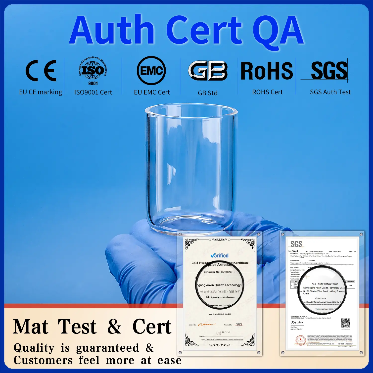 La calidad es primordial en nuestro proceso de fabricación. Somos un fabricante certificado ISO 9001:2015, lo que garantiza que nuestros procesos cumplen con los estándares internacionales de gestión de calidad.Nuestros productos también se someten a rigurosas pruebas SGS de pureza y rendimiento. Utilizamos materias primas de alta pureza (hasta 99,998% de SiO2) para producir productos de cuarzo fundido y sílice fundida con una estabilidad térmica excepcional, alta resistencia a la temperatura e inercia química.