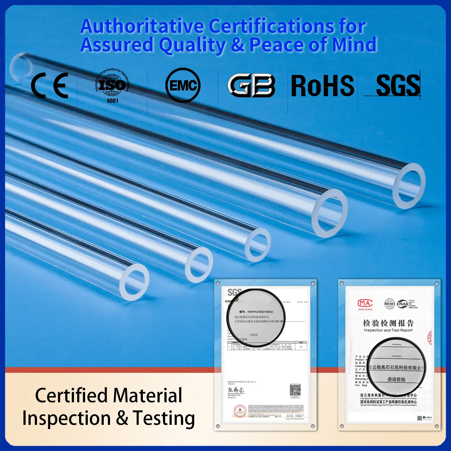 品質は当社の製造プロセスにおいて最も重要です。当社はISO 9001:2015認証取得メーカーであり、当社のプロセスが国際的な品質管理基準を満たしていることを保証します。また、当社の製品は純度と性能に関して厳格なSGS試験を受けています。当社は高純度原材料(SiO2 99.998%まで)を使用し、優れた熱安定性、高温耐性、化学的不活性を持つ溶融石英および溶融シリカ製品を製造しています。